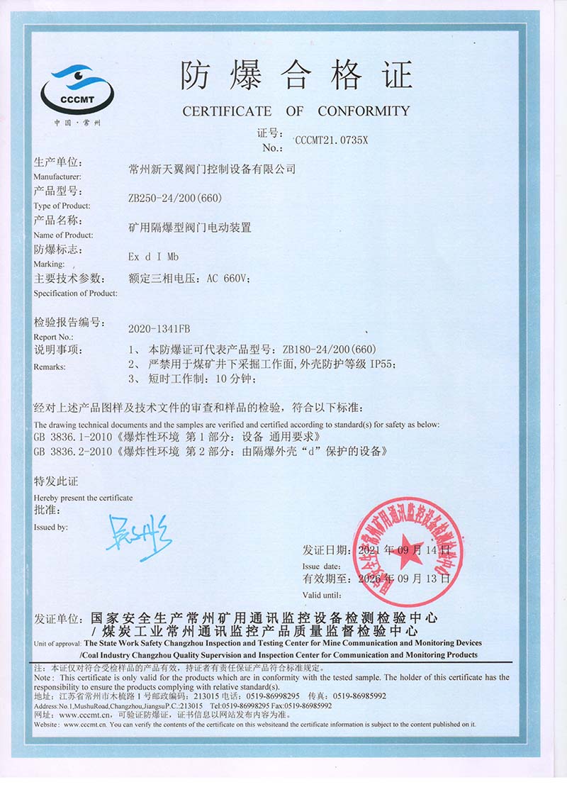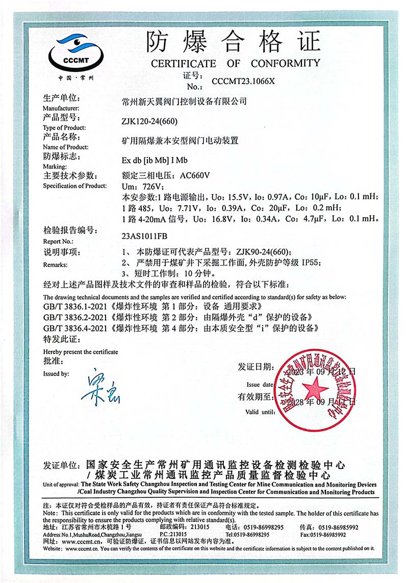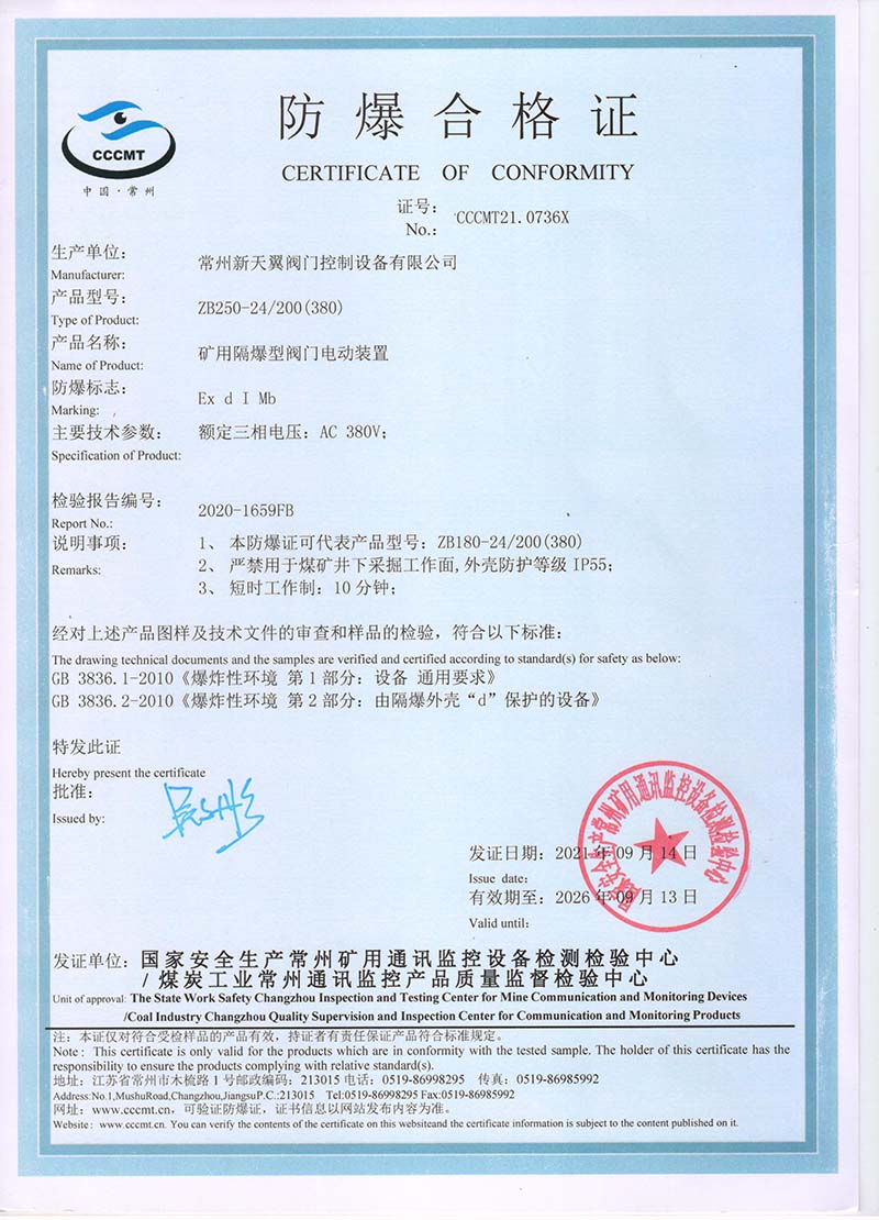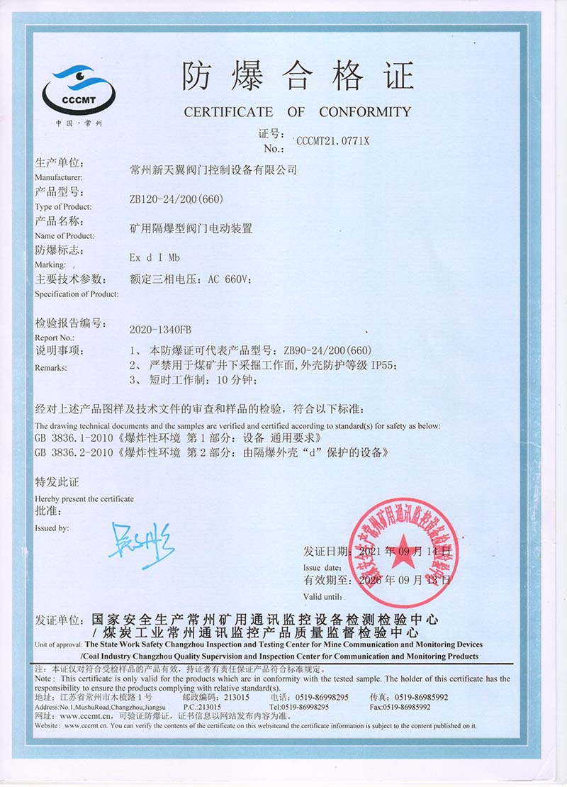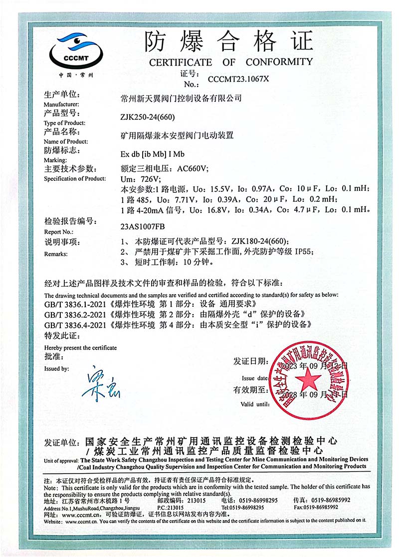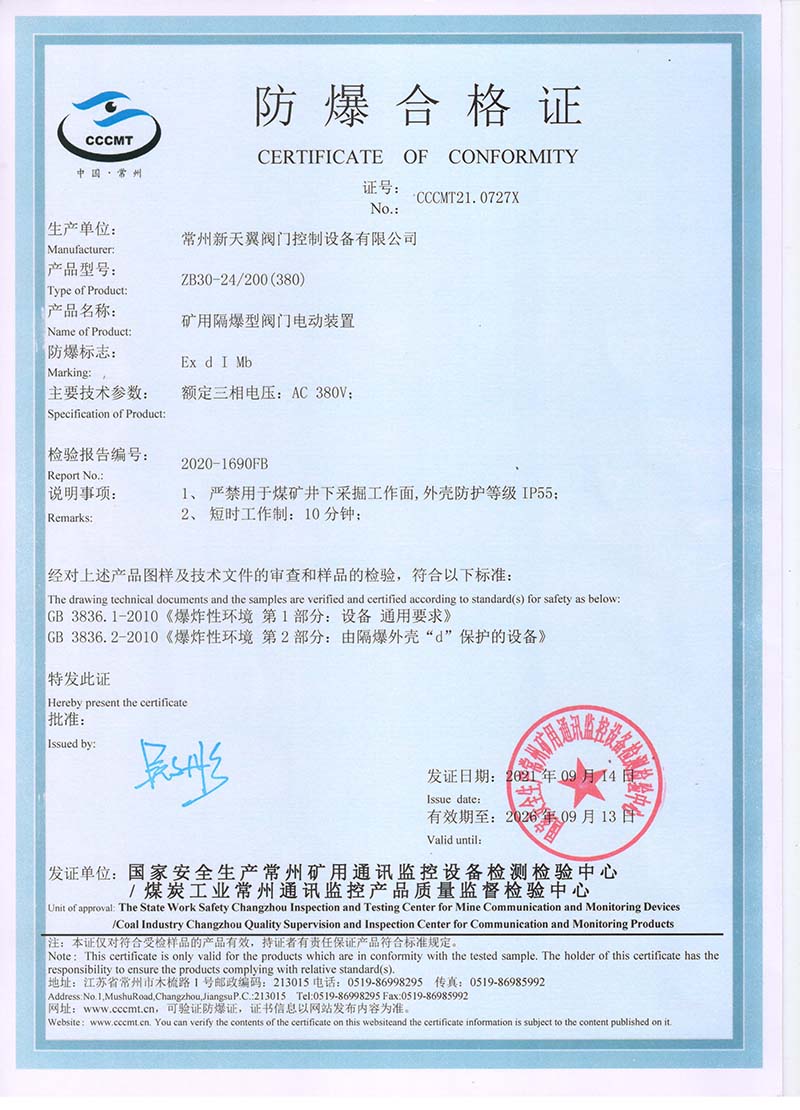 礦用隔爆ZB10-24中國國家強制性產品認證證書110.2