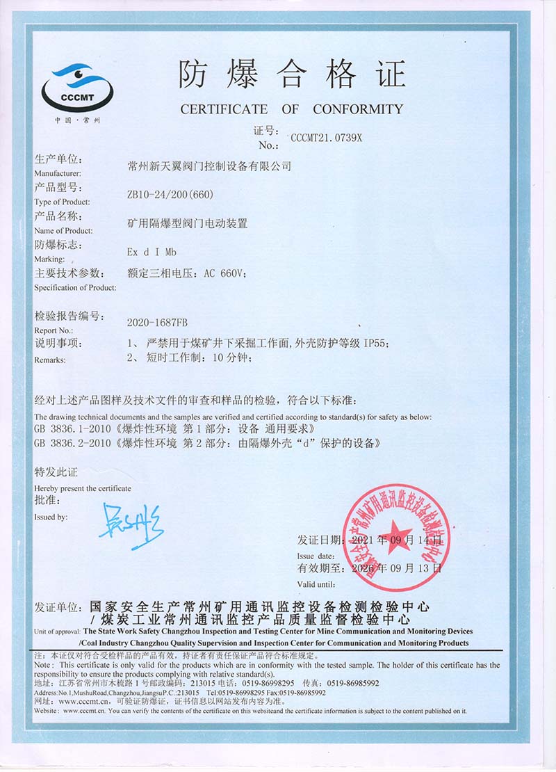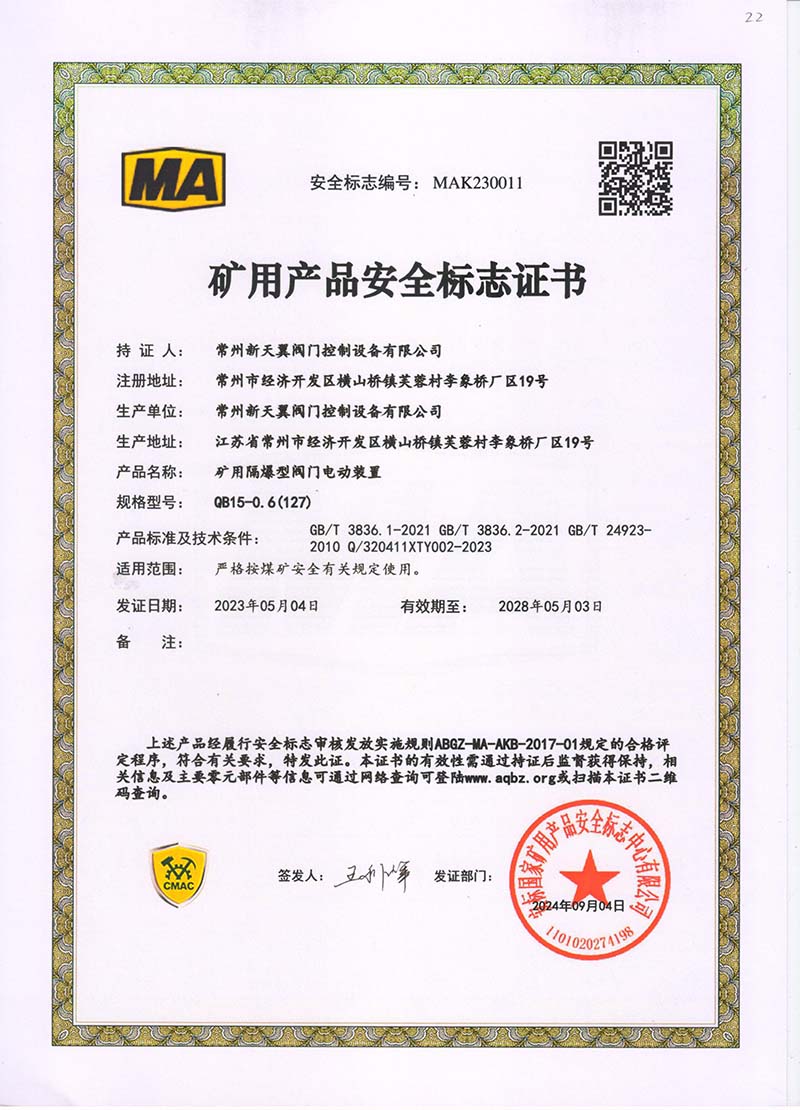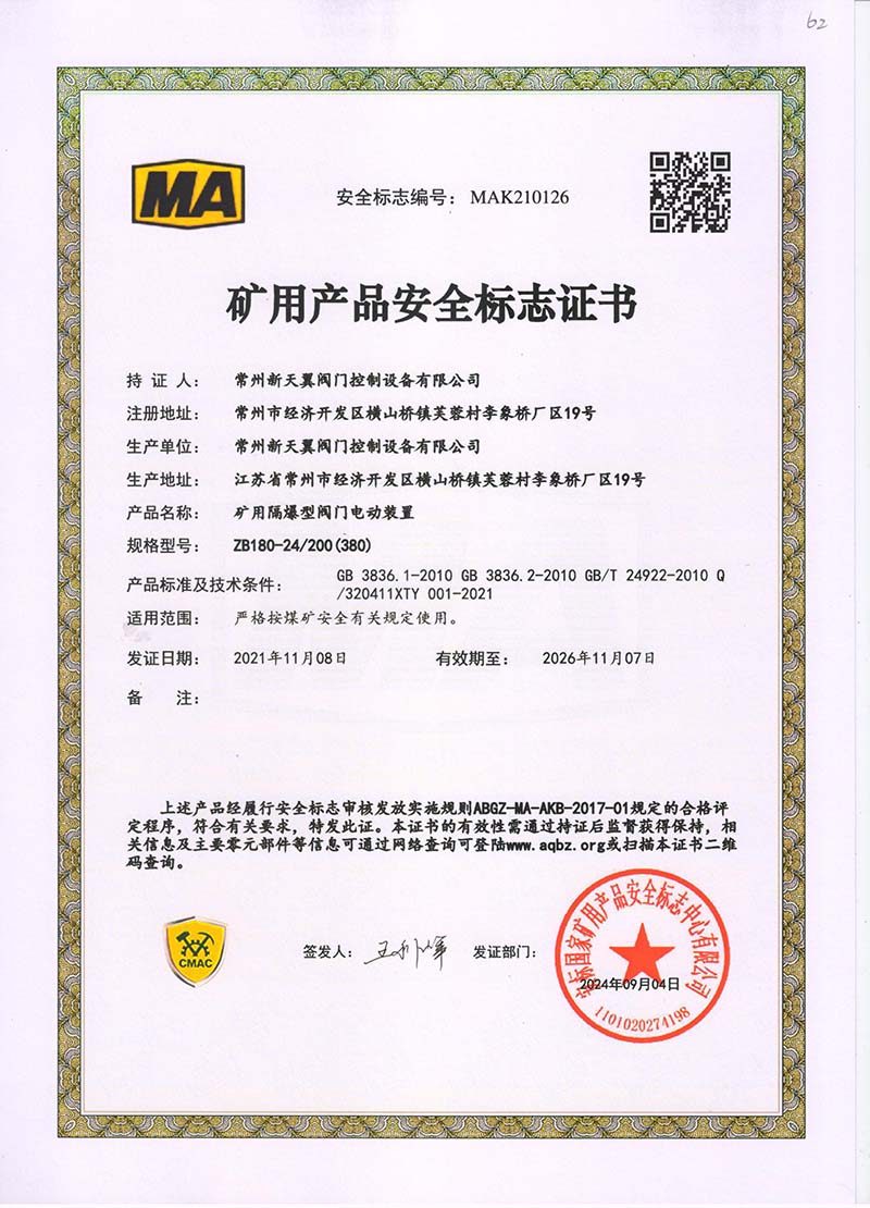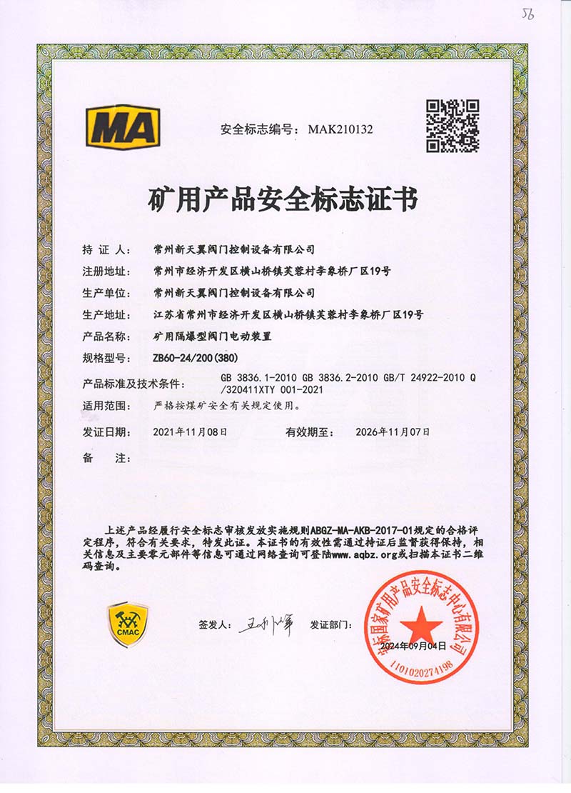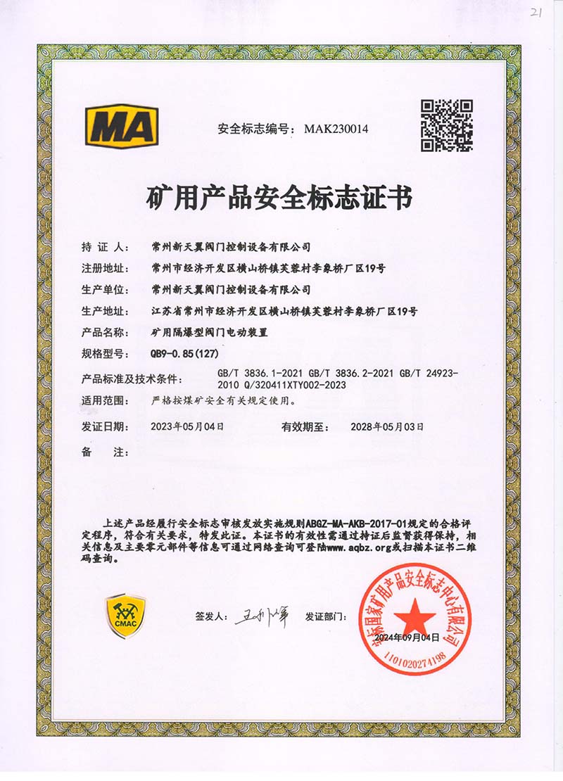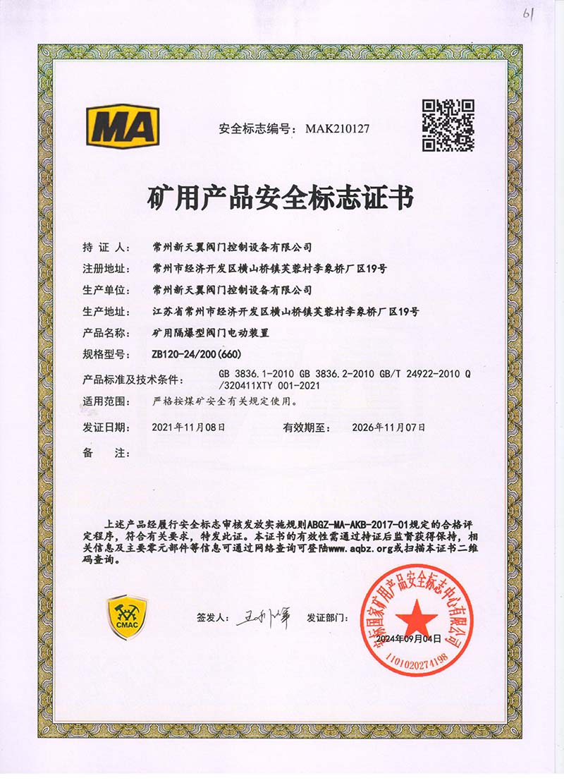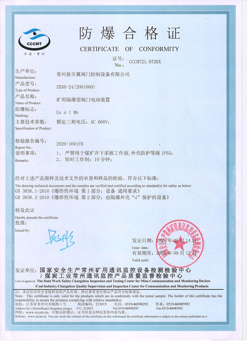 礦用隔爆ZB10-24中國國家強制性產品認證證書110.2