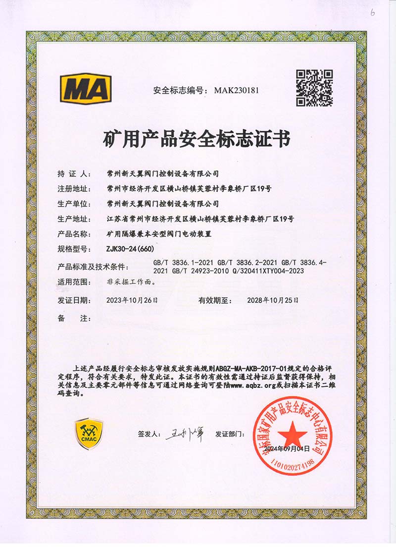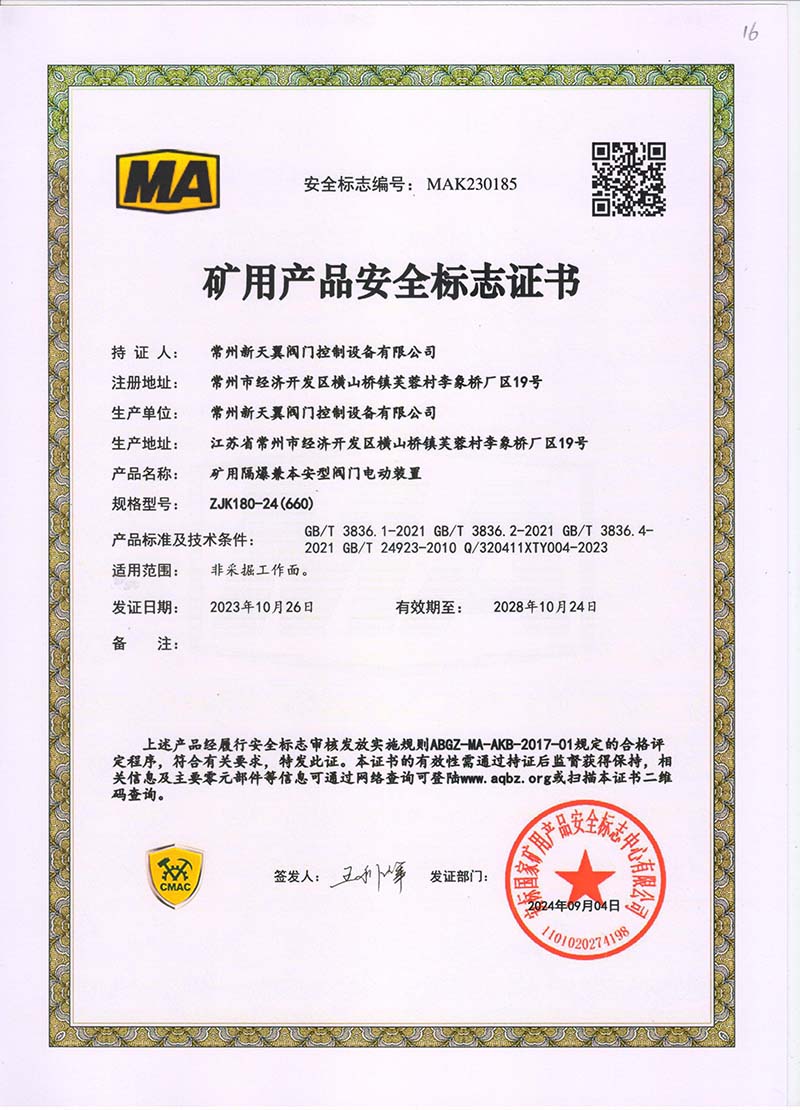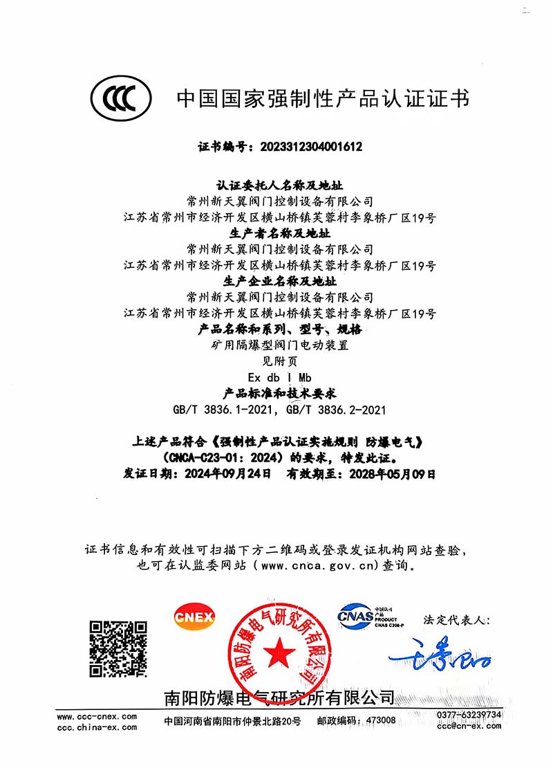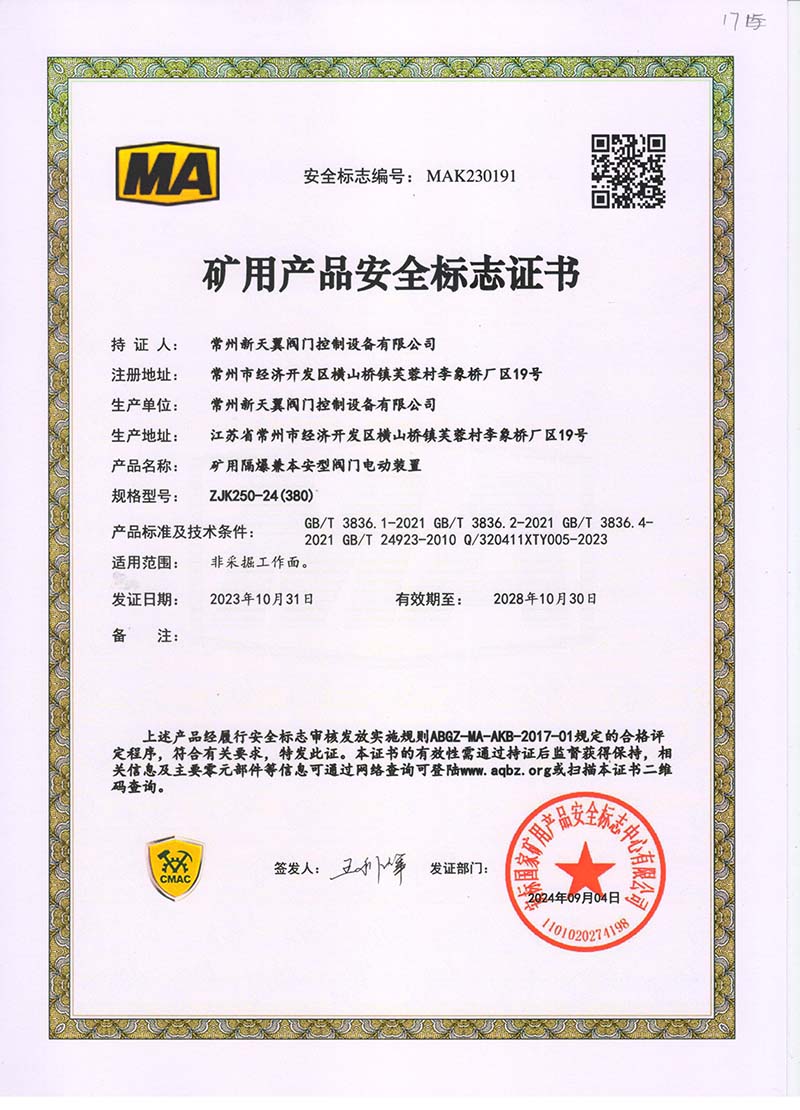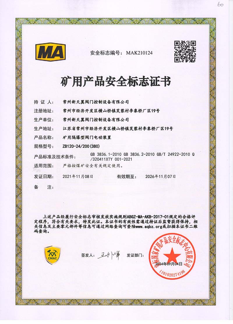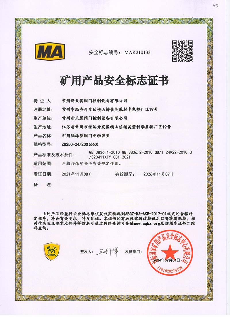 礦用隔爆ZB10-24中國國家強制性產品認證證書110.2